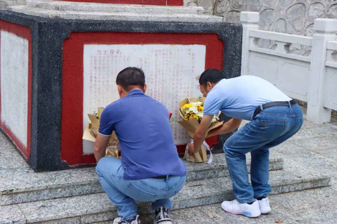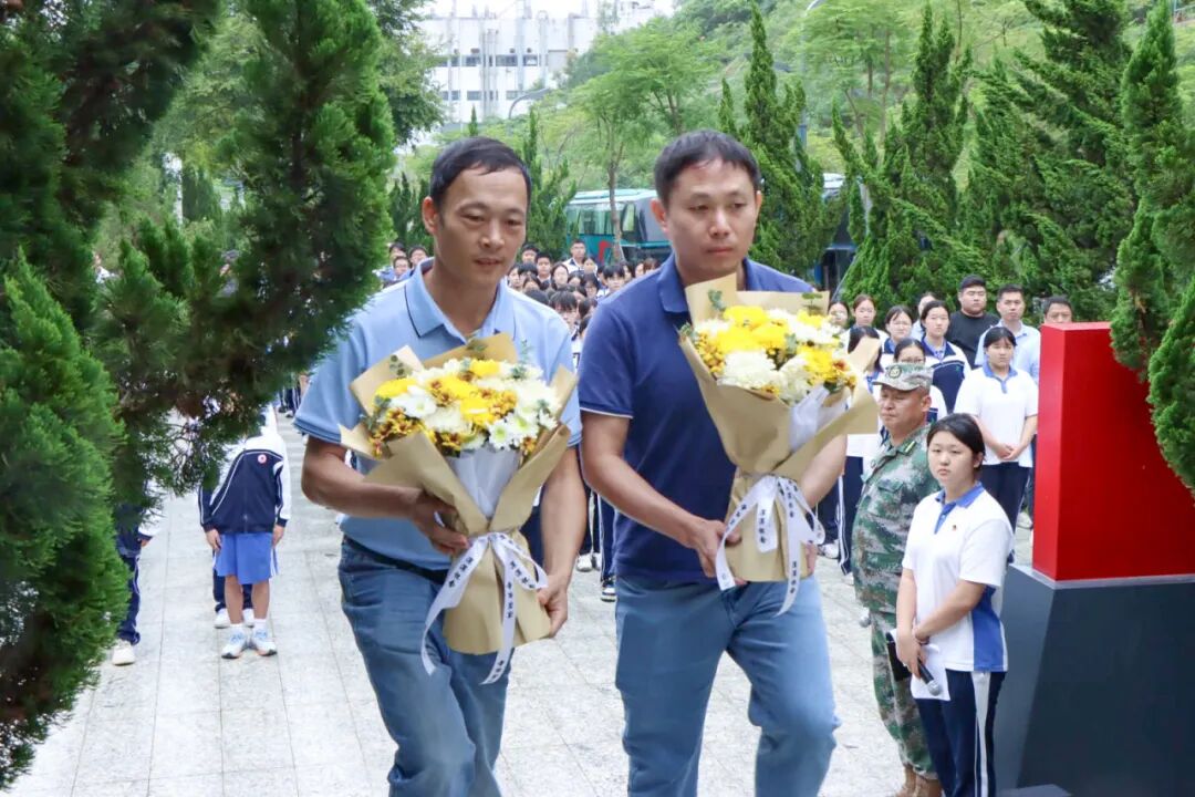 白花洞烈士纪念园里,育新营地综合实践课教师代表邓峰与我校德育副校长梁雄创向革命先烈敬献花束,气氛庄重而肃穆。